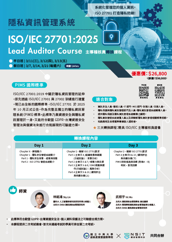 PIMS 的國際標準-ISO27701 (ISO27001 與 ISO27002 之隱私資訊管理延伸)已於 2025 年 10 月正式公告,此標準乃集資通安全與隱私資訊管理於一身,又能符合歐盟 GDPR、台灣資通安全管理法與個資法來進行合規展現的可驗證方案。本課程內容包含 ISO27701 國際標準(整合資通安全與隱私資訊保護之管理系統,含:隱私資訊控制者控制措施與隱私資訊處理者控制措施)、ISO29134 隱私衝擊分析、ISO29100 隱私框架、ISO27001 資訊安全管理系統、ISO27002 資訊安全管理作業規範標準、ISO27009 特殊領域的 ISO27001 驗證要求、ISO19011 管理系統稽核指引、ISO31000 風險管理、ISO27005 資訊安全風險管理、歐盟 GDPR 與 EDPB 詮釋文件、資通安全管理法與相關子法、個資法與施行細則及講師選定的專業補充文件等,完整涵蓋了資安與隱私資訊管理領域。
