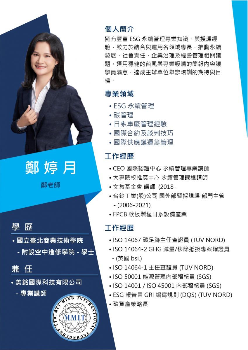 1. 國內外永續趨勢及架構及能源轉型落實和目標 2.碳資產管理策略分析及碳中和規範與實踐 |