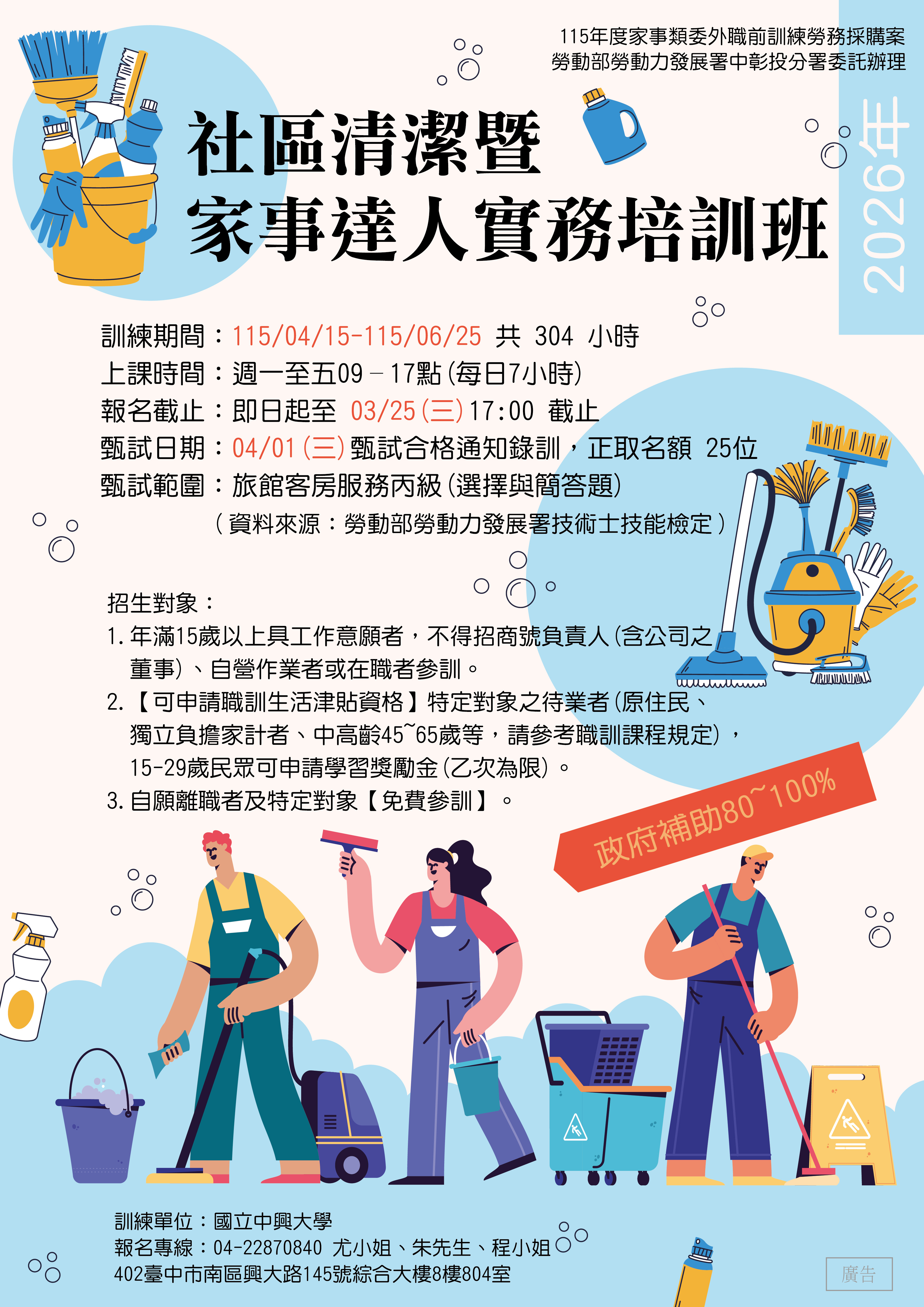 報名日期: 即日起至115年3月25日 下午17點截止,並於115年4月1日辦理甄試,經甄試後合格通知錄訓。
