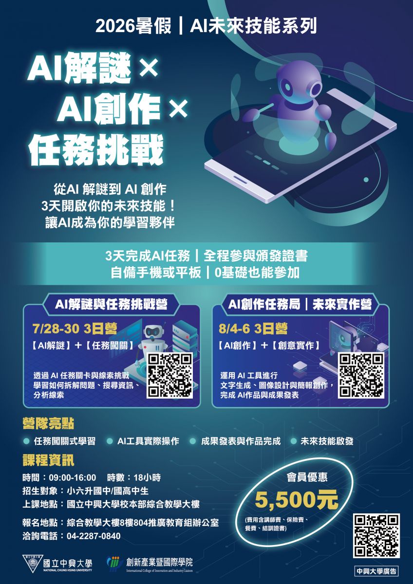 ⚠️ 小提醒:報名時請記得填寫實際參加課程的同學資料,用於證書、保險與便當等安排。若為家長代填,請確認資料為實際上課學員。