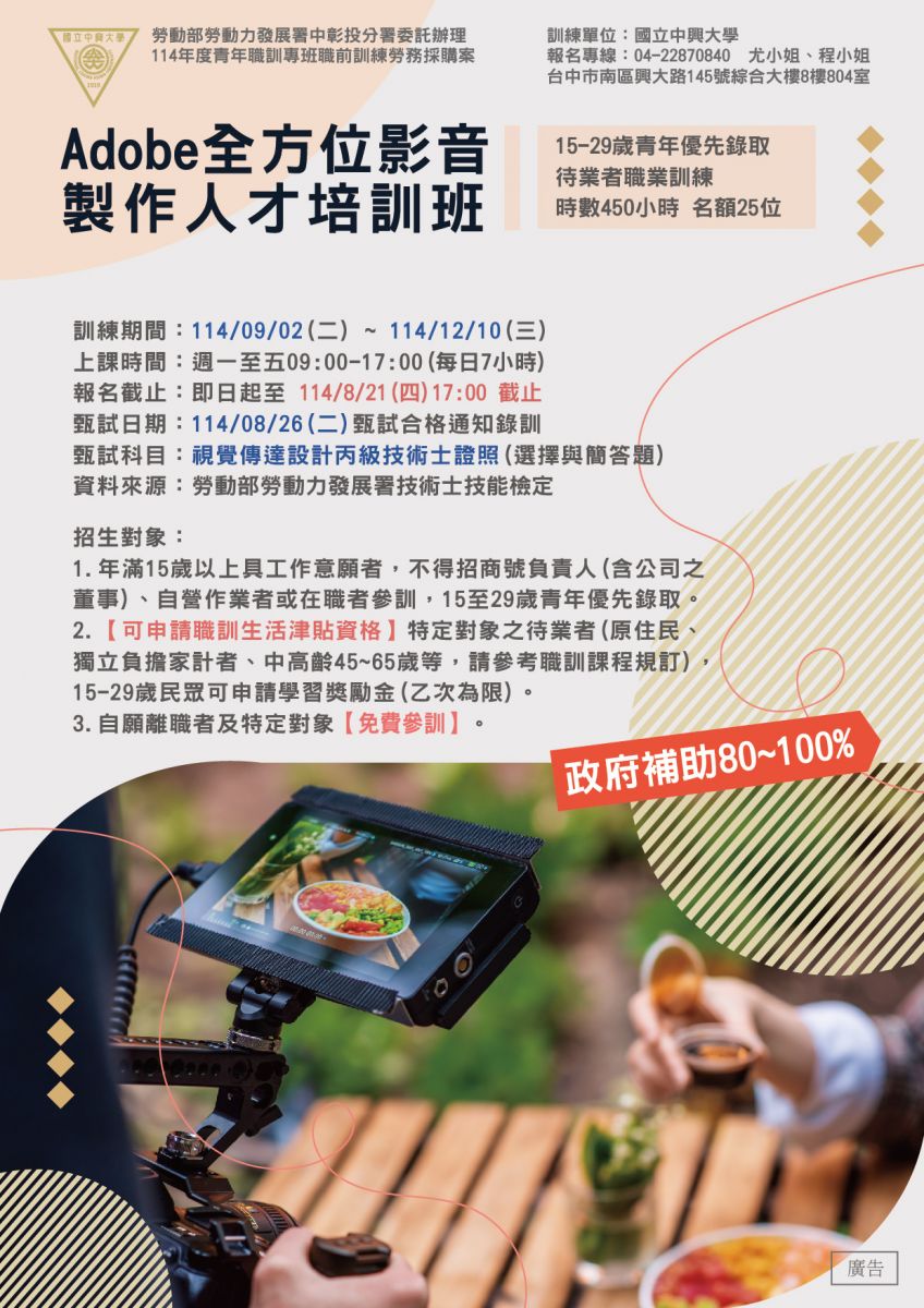 首頁 / 最新消息 / 招生中-【青年專班】Adobe全方位影音製作人才培訓班,具勞保記錄全額免費