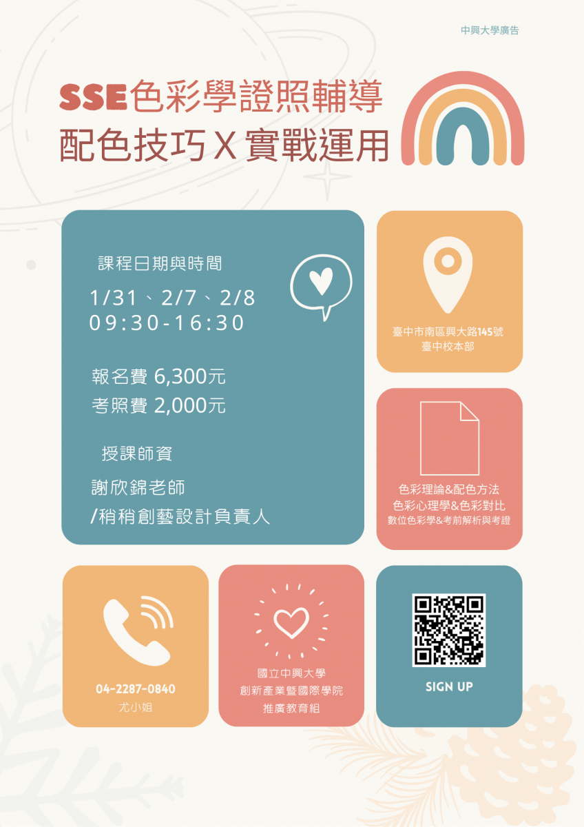 首頁 / 最新消息 / 【SSE證照】色彩學證照輔導:配色技巧X實戰運用 (1/31、2/7、2/8)與考照專區同梯次|
