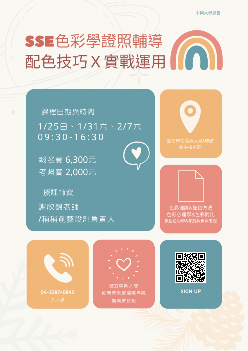 首頁 / 最新消息 / 【SSE證照-確定開課】色彩學證照輔導:配色技巧X實戰運用 (1/25、1/31、2/7)與考照專區同梯次|