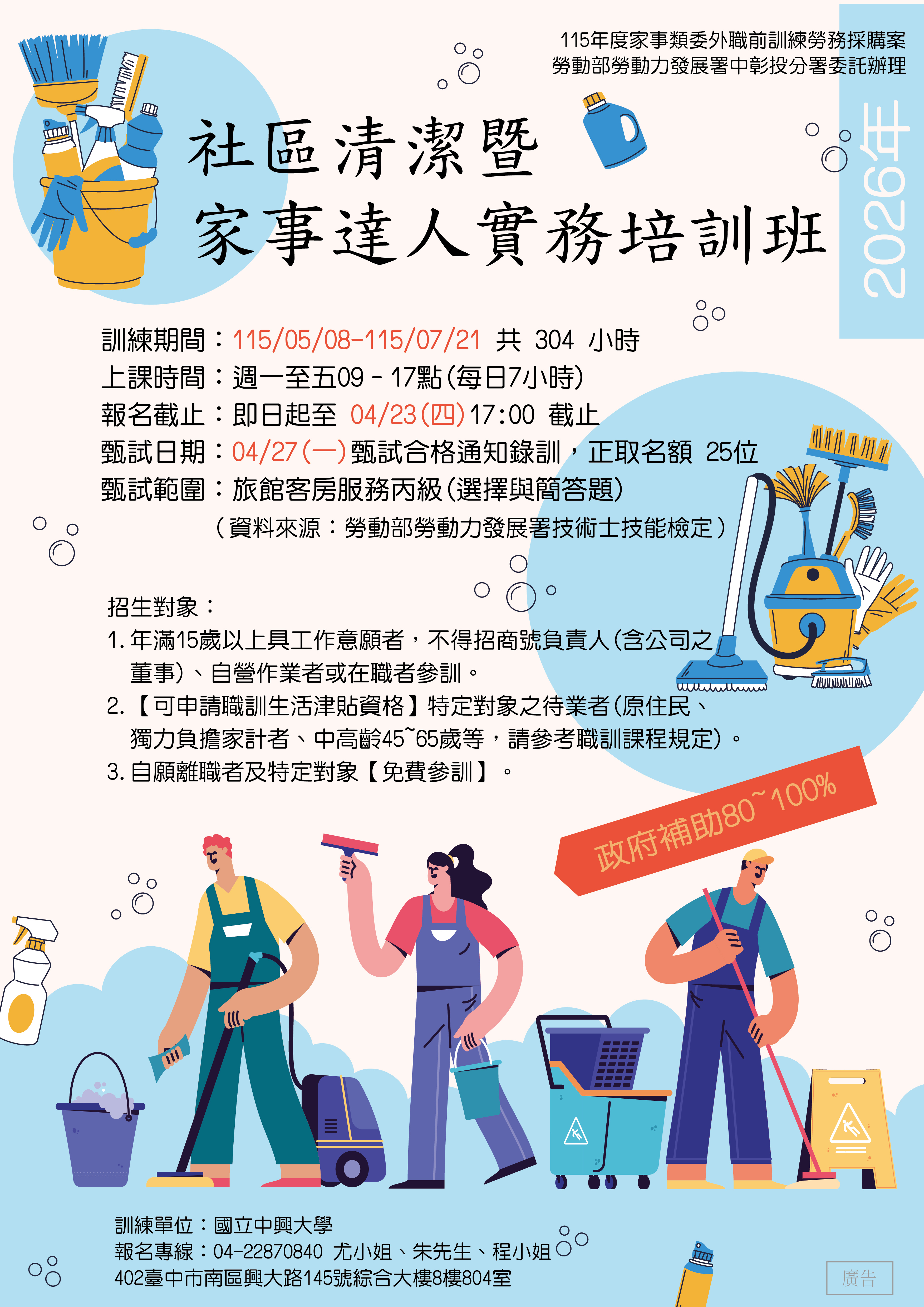 報名日期: 即日起至115年4月23日 下午17點截止,並於115年4月27日辦理甄試,經甄試後合格通知錄訓。