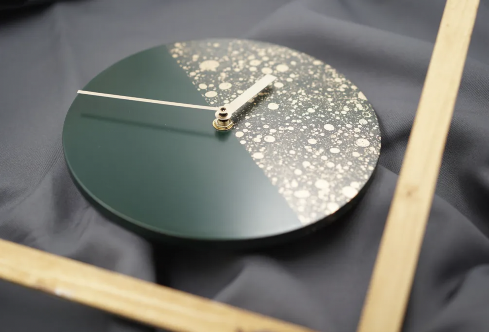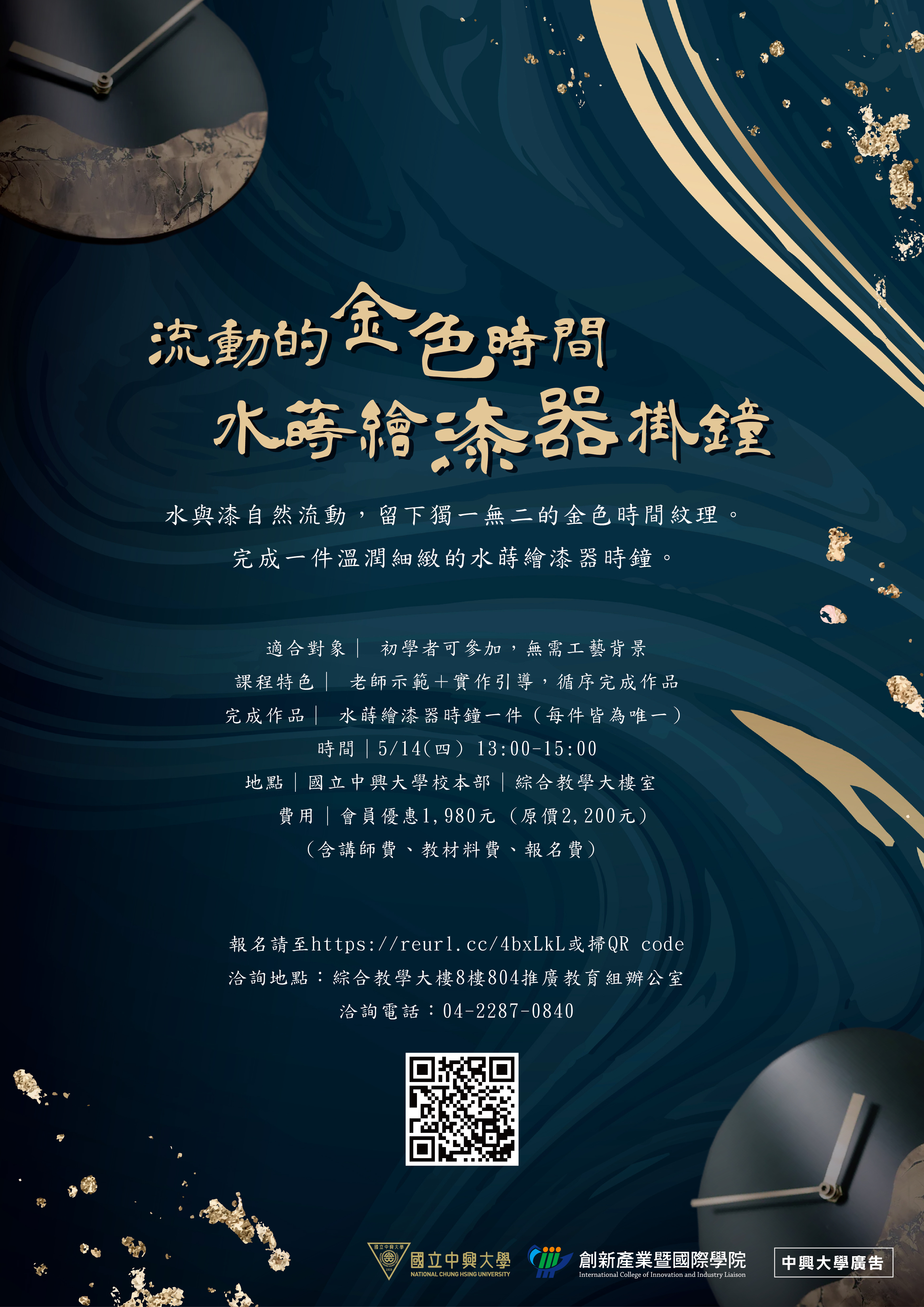 以傳統漆器手法製作,經手工反覆研磨、推光,呈現漆器溫潤光澤。課程使用漆器的蜻蛉塗技法延伸出「水蒔繪」創作方式,以水跟漆不同比重的特性,產生隨機的流動紋路,附著在平整光滑的鐘板後,再以金屬粉末加飾,製作出金色的波紋圖樣,即使是初學者也能輕易上手。